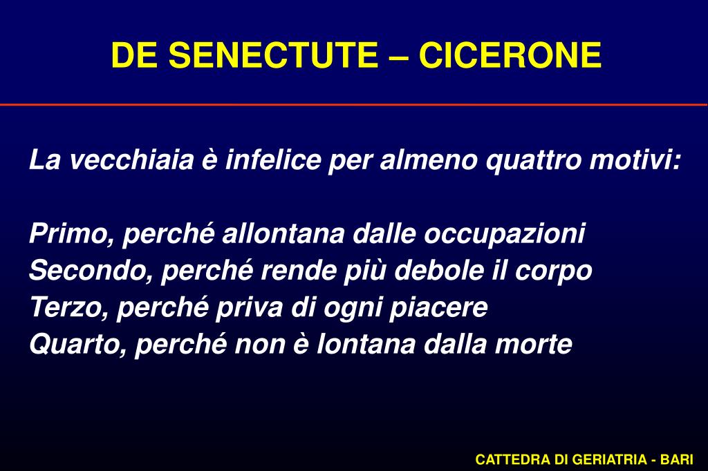 DE SENECTUTE – CICERONE La vecchiaia è infelice per almeno quattro motivi: Primo, perché allontana dalle occupazioni Secondo, perché rende più debole il corpo Terzo, perché priva di ogni piacere Quarto, perché non è lontana dalla morte CATTEDRA DI GERIATRIA - BARI