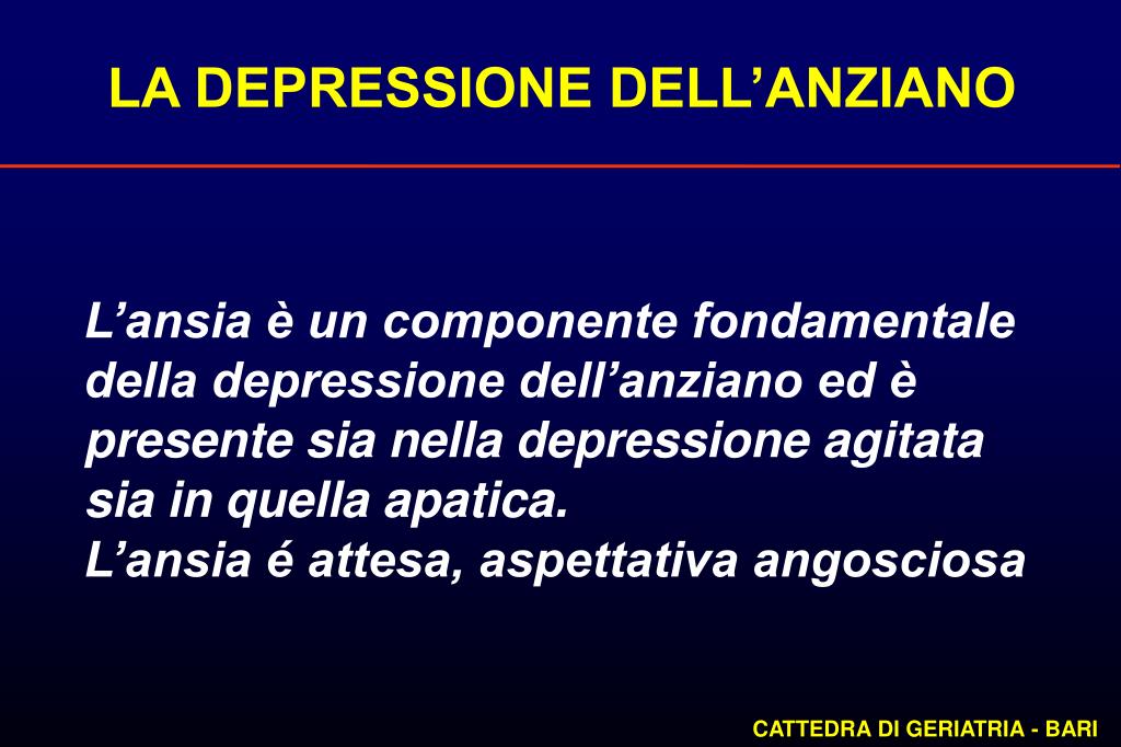 LA DEPRESSIONE DELL’ANZIANO L’ansia è un componente fondamentale della depressione dell’anziano ed è presente sia nella depressione agitata sia in quella apatica. L’ansia é attesa, aspettativa angosciosa CATTEDRA DI GERIATRIA - BARI