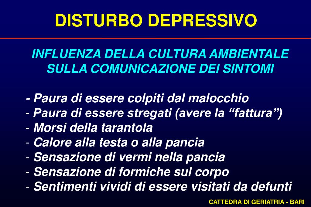 DISTURBO DEPRESSIVO INFLUENZA DELLA CULTURA AMBIENTALESULLA COMUNICAZIONE DEI SINTOMI - Paura di essere colpiti dal malocchio • Paura di essere stregati (avere la “fattura”) • Morsi della tarantola • Calore alla testa o alla pancia • Sensazione di vermi nella pancia • Sensazione di formiche sul corpo • Sentimenti vividi di essere visitati da defunti CATTEDRA DI GERIATRIA - BARI
