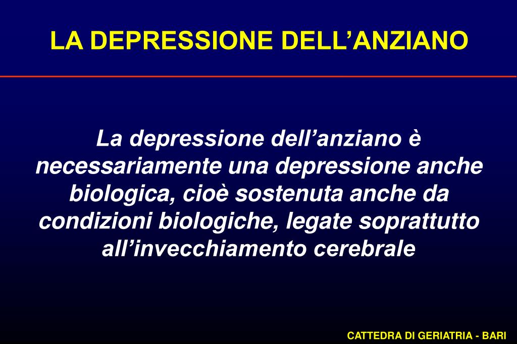 LA DEPRESSIONE DELL’ANZIANO La depressione dell’anziano è necessariamente una depressione anche biologica, cioè sostenuta anche da condizioni biologiche, legate soprattutto all’invecchiamento cerebrale CATTEDRA DI GERIATRIA - BARI
