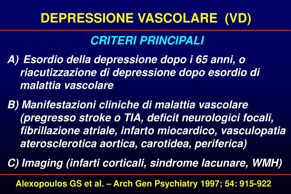 DEPRESSIONE VASCOLARE (VD) Vi sono evidenze cliniche e sperimentali che depongono per l’esistenza di un sottotipo di depressione ad insorgenza tardiva, di cui la cerebro-vasculopatia (CVD) potrebbe essere un fattore causale. Questa forma di depressione ad insorgenza tardiva è stata denominata “Depressione Vascolare” (Vascular Depression, VD)
