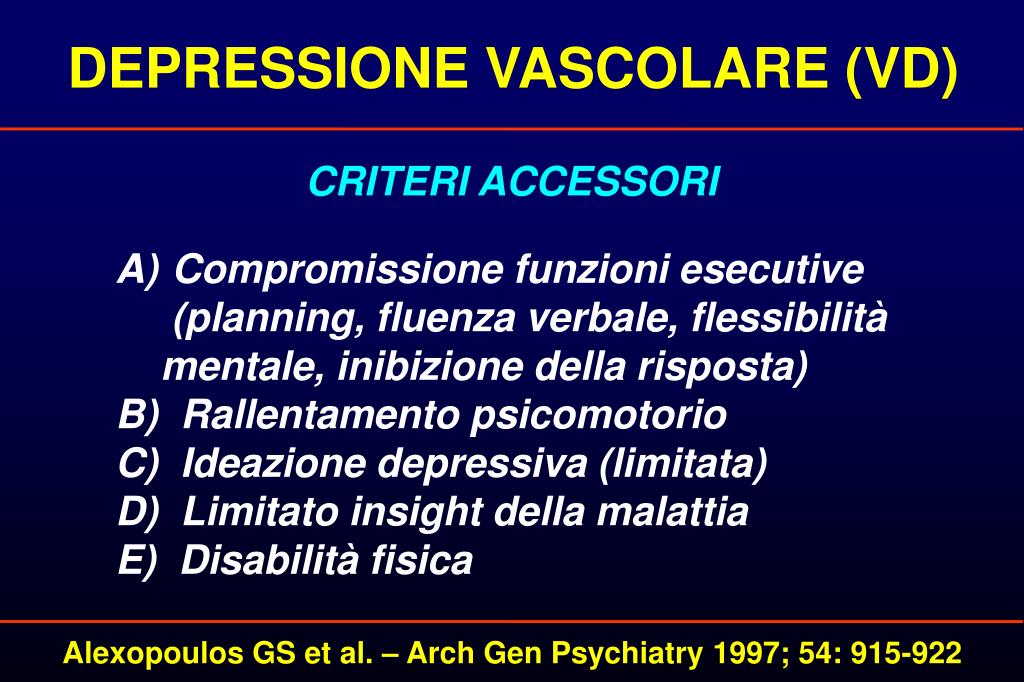 DEPRESSIONE VASCOLARE (VD) CRITERI ACCESSORI • Compromissione funzioni esecutive (planning, fluenza verbale, flessibilità mentale, inibizione della risposta) B) Rallentamento psicomotorio C) Ideazione depressiva (limitata) D) Limitato insight della malattia E) Disabilità fisica Alexopoulos GS et al. – Arch Gen Psychiatry 1997; 54: 915-922