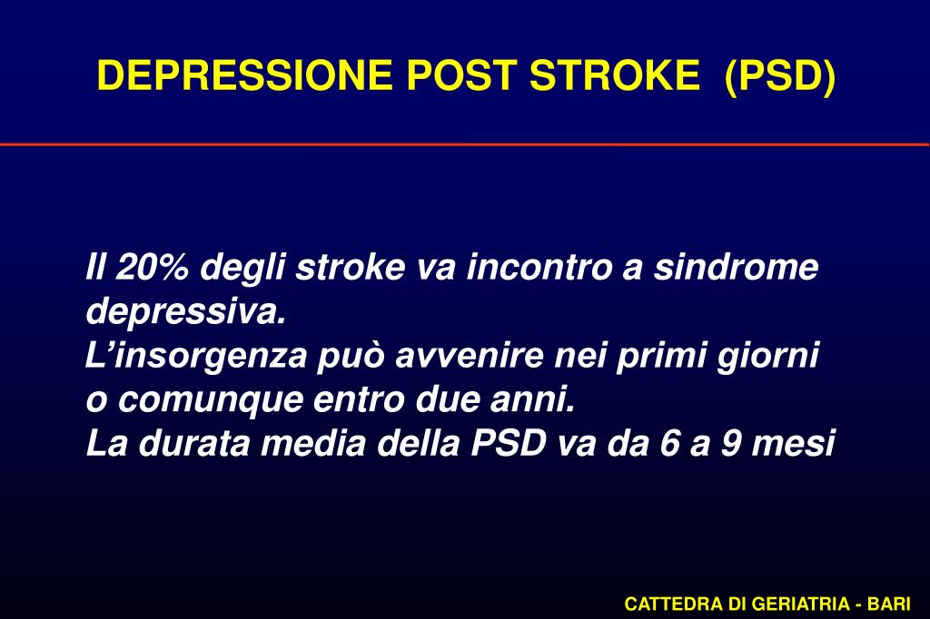 DEPRESSIONE POST STROKE (PSD) Il 20% degli stroke va incontro a sindrome depressiva. L’insorgenza può avvenire nei primi giorni o comunque entro due anni. La durata media della PSD va da 6 a 9 mesi CATTEDRA DI GERIATRIA - BARI