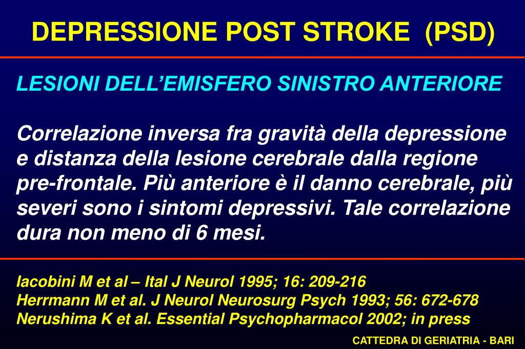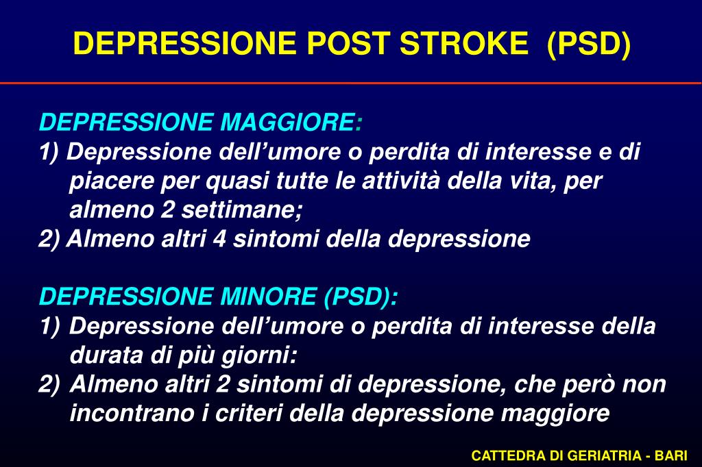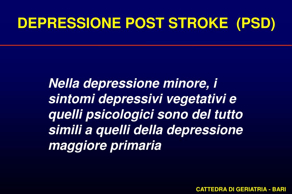 DEPRESSIONE POST STROKE (PSD) La depressione è probabilmente il disordine emozionale più frequente e grave che segue ad uno stroke. Può insorgere una depressione maggiore o, più frequentemente, una depressione minore. CATTEDRA DI GERIATRIA - BARI
