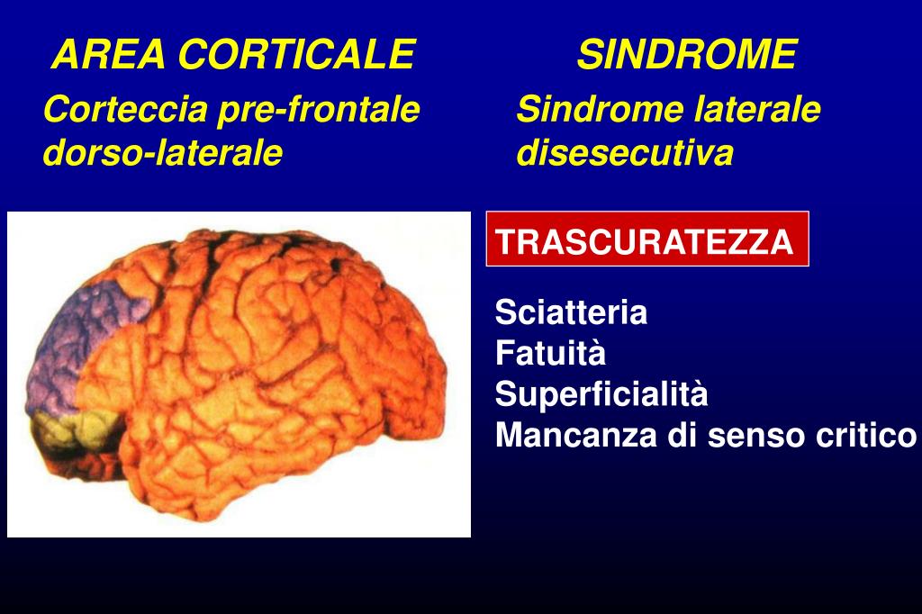 AREA CORTICALE SINDROME Corteccia pre-frontale dorso-laterale Sindrome laterale disesecutiva TRASCURATEZZA Sciatteria Fatuità Superficialità Mancanza di senso critico