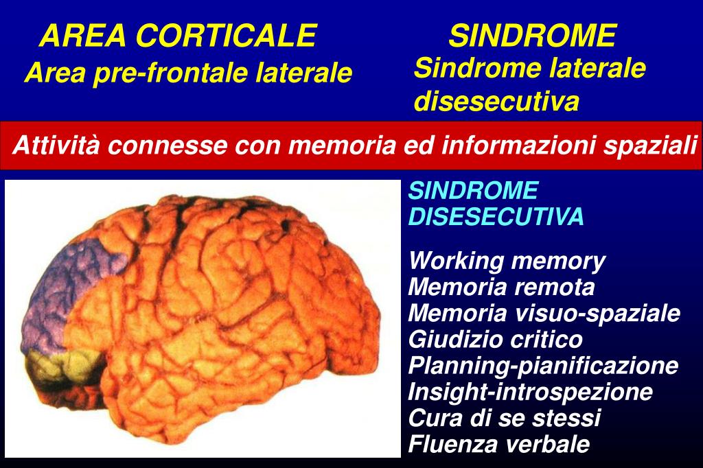 AREA CORTICALE SINDROME Sindrome laterale disesecutiva Area pre-frontale laterale Attività connesse con memoria ed informazioni spaziali SINDROME DISESECUTIVA Working memory Memoria remota Memoria visuo-spaziale Giudizio critico Planning-pianificazione Insight-introspezione Cura di se stessi Fluenza verbale