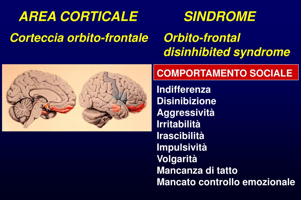 AREA CORTICALE SINDROME Corteccia orbito-frontale Orbito-frontal disinhibited syndrome COMPORTAMENTO SOCIALE Indifferenza Disinibizione Aggressività Irritabilità Irascibilità Impulsività Volgarità Mancanza di tatto Mancato controllo emozionale
