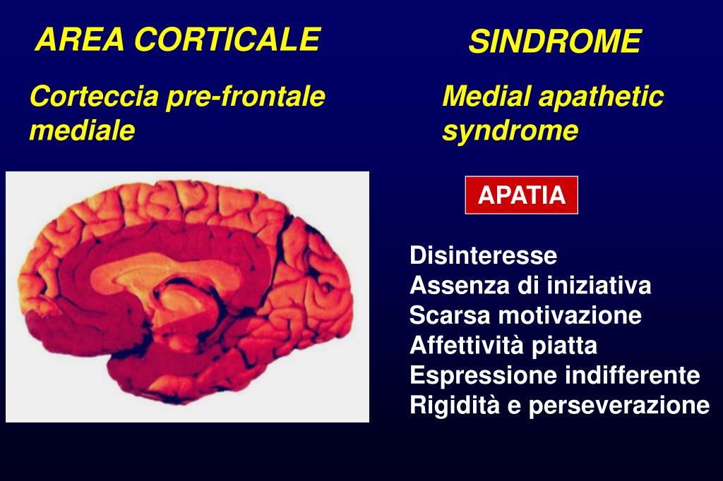 AREA CORTICALE SINDROME Corteccia pre-frontale mediale Medial apathetic syndrome APATIA Disinteresse Assenza di iniziativa Scarsa motivazione Affettività piatta Espressione indifferente Rigidità e perseverazione