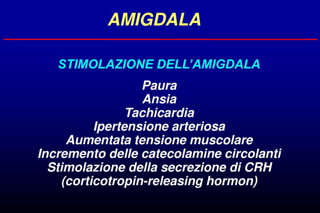 AMIGDALA STIMOLAZIONE DELL’AMIGDALA Paura Ansia Tachicardia Ipertensione arteriosa Aumentata tensione muscolare Incremento delle catecolamine circolanti Stimolazione della secrezione di CRH (corticotropin-releasing hormon)