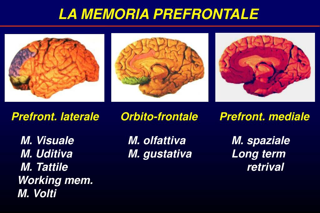 LA MEMORIA PREFRONTALE Prefront. laterale Orbito-frontale Prefront. mediale M. Visuale M. olfattiva M. spaziale M. Uditiva M. gustativa Long term M. Tattile retrival Working mem. M. Volti