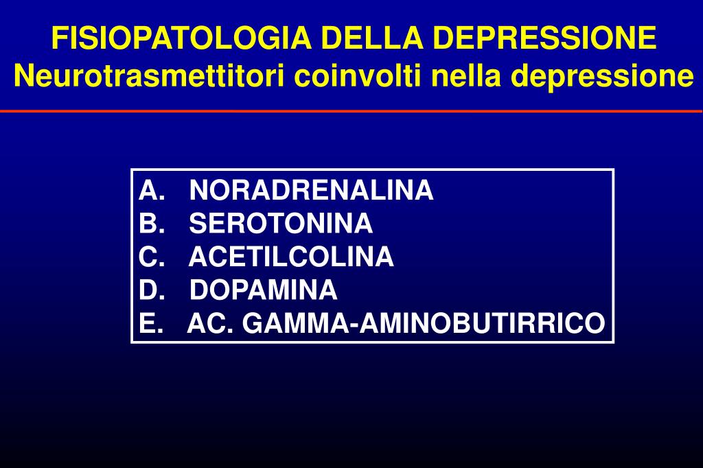 FISIOPATOLOGIA DELLA DEPRESSIONE Neurotrasmettitori coinvolti nella depressione A. NORADRENALINA B. SEROTONINA C. ACETILCOLINA D. DOPAMINA E. AC. GAMMA-AMINOBUTIRRICO