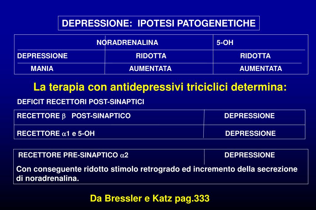 DEPRESSIONE: IPOTESI PATOGENETICHE NORADRENALINA 5-OH DEPRESSIONE RIDOTTA RIDOTTA MANIA AUMENTATA AUMENTATA La terapia con antidepressivi triciclici determina: DEFICIT RECETTORI POST-SINAPTICI RECETTORE POST-SINAPTICO DEPRESSIONE RECETTORE 1 e 5-OH DEPRESSIONE RECETTORE PRE-SINAPTICO 2 DEPRESSIONE Con conseguente ridotto stimolo retrogrado ed incremento della secrezione di noradrenalina. Da Bressler e Katz pag.333