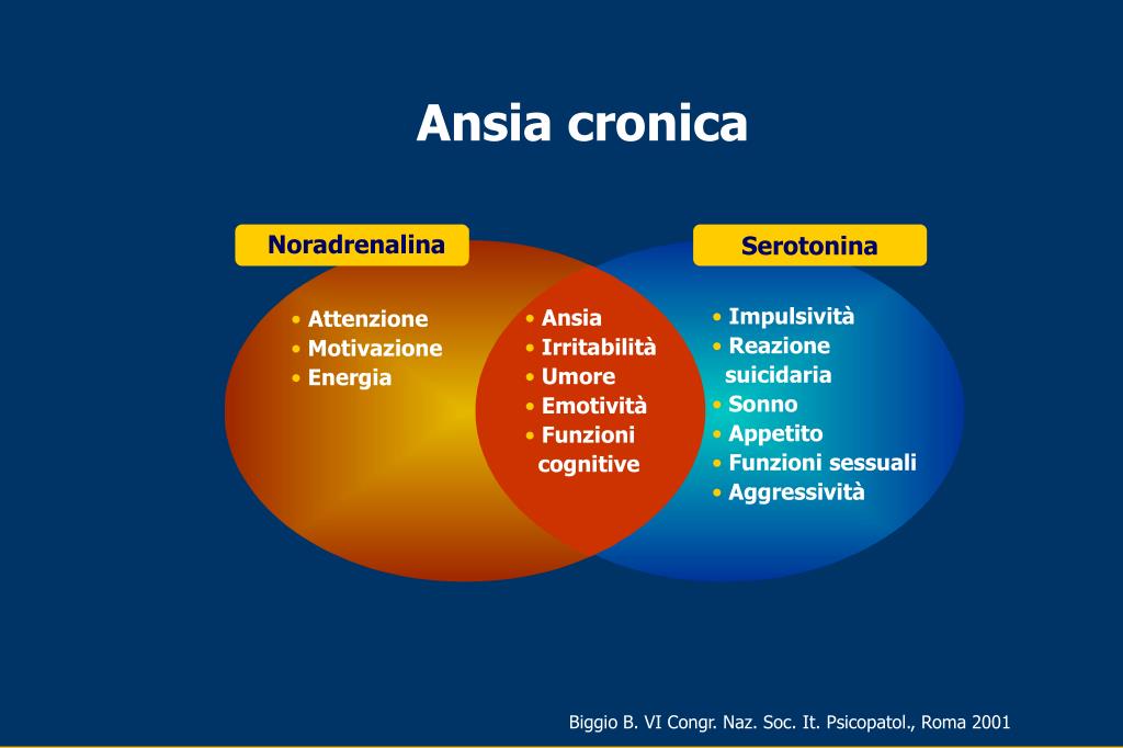 Ansia cronica Noradrenalina Serotonina • Impulsività • Reazione suicidaria • Sonno • Appetito • Funzioni sessuali • Aggressività • Ansia • Irritabilità • Umore • Emotività • Funzioni cognitive • Attenzione • Motivazione • Energia Biggio B. VI Congr. Naz. Soc. It. Psicopatol., Roma 2001