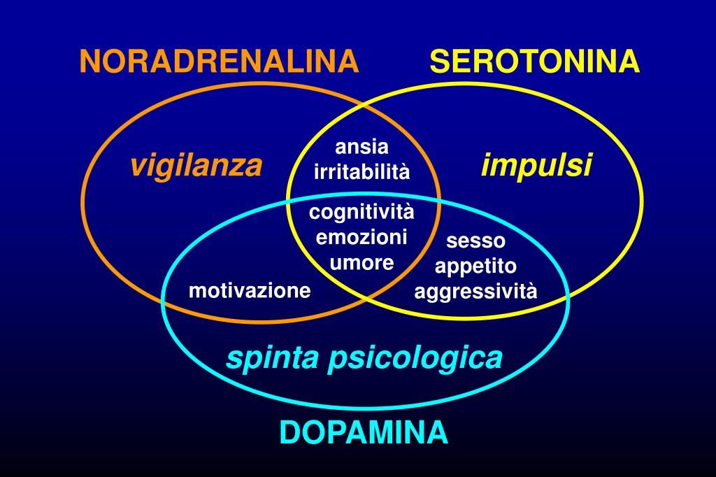 NORADRENALINA SEROTONINA ansia irritabilità vigilanza impulsi cognitività emozioni umore sesso appetito aggressività motivazione spinta psicologica DOPAMINA