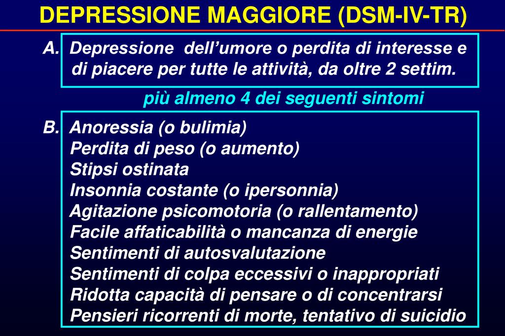 DEPRESSIONE MAGGIORE (DSM-IV-TR) • Depressione dell’umore o perdita di interesse e di piacere per tutte le attività, da oltre 2 settim. più almeno 4 dei seguenti sintomi B. Anoressia (o bulimia) Perdita di peso (o aumento) Stipsi ostinata Insonnia costante (o ipersonnia) Agitazione psicomotoria (o rallentamento) Facile affaticabilità o mancanza di energie Sentimenti di autosvalutazione Sentimenti di colpa eccessivi o inappropriati Ridotta capacità di pensare o di concentrarsi Pensieri ricorrenti di morte, tentativo di suicidio