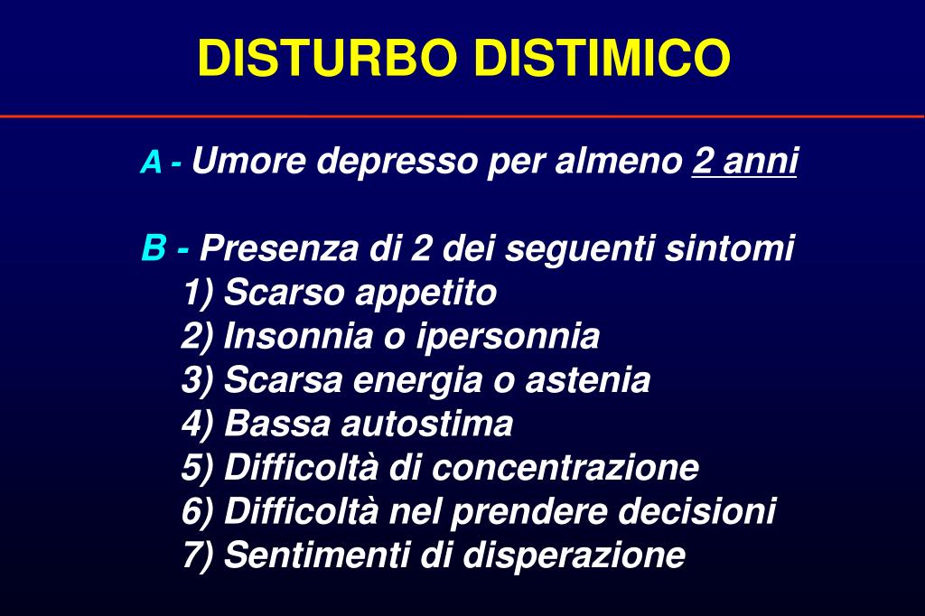 DISTURBO DISTIMICO A -Umore depresso per almeno 2 anni B - Presenza di 2 dei seguenti sintomi 1) Scarso appetito 2) Insonnia o ipersonnia 3) Scarsa energia o astenia 4) Bassa autostima 5) Difficoltà di concentrazione 6) Difficoltà nel prendere decisioni 7) Sentimenti di disperazione