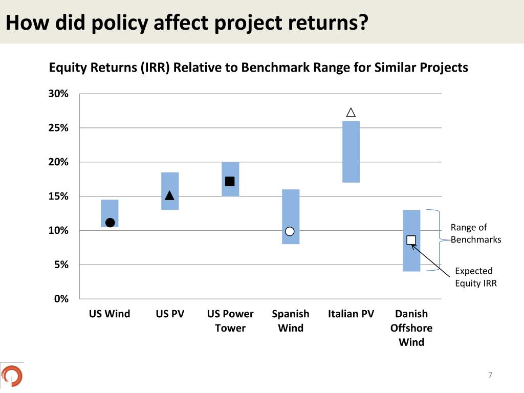 How did policy affect project returns? Equity Returns (IRR) Relative to Benchmark Range for Similar Projects Range of Benchmarks Expected Equity IRR