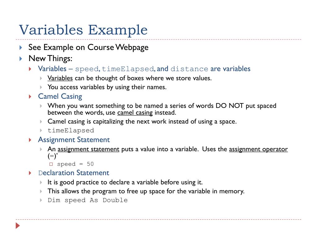 Variables Example • See Example on Course Webpage • New Things: • Variables – speed, timeElapsed, and distance are variables • Variables can be thought of boxes where we store values. • You access variables by using their names. • Camel Casing • When you want something to be named a series of words DO NOT put spaced between the words, use camel casing instead. • Camel casing is capitalizing the next work instead of using a space. • timeElapsed • Assignment Statement • An assignment statement puts a value into a variable. Uses the assignment operator (=)’ • speed = 50 • Declaration Statement • It is good practice to declare a variable before using it. • This allows the program to free up space for the variable in memory. • Dim speed As Double