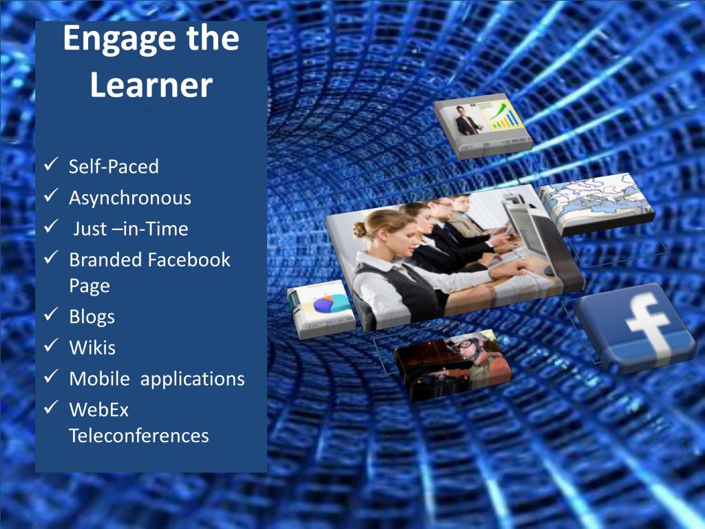 Engage the Learner Self-Paced Asynchronous Just –in-Time Branded Facebook Page Blogs Wikis Mobile applications WebEx Teleconferences