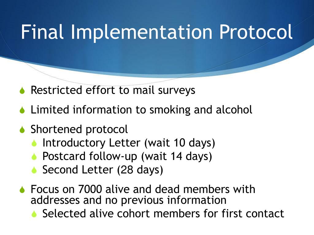 Final Implementation Protocol • Restricted effort to mail surveys • Limited information to smoking and alcohol • Shortened protocol • Introductory Letter (wait 10 days) • Postcard follow-up (wait 14 days) • Second Letter (28 days) • Focus on 7000 alive and dead members with addresses and no previous information • Selected alive cohort members for first contact