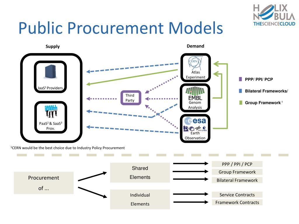 Public Procurement Models Demand Supply PPP/ PPI/ PCP Bilateral Frameworks/ Group Framework 1 Atlas Experiment IaaS1 Providers Genom Analysis Third Party • PaaS2 & SaaS3 Prov. Earth Observation 1CERN would be the best choice due to Industry Policy Procurement PPP / PPI / PCP Shared Elements Group Framework Procurement of ... Bilateral Framework Individual Elements Service Contracts Framework Contracts