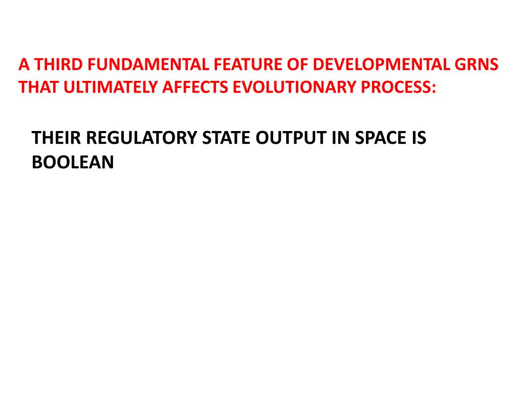 A THIRD FUNDAMENTAL FEATURE OF DEVELOPMENTAL GRNS THAT ULTIMATELY AFFECTS EVOLUTIONARY PROCESS: THEIR REGULATORY STATE OUTPUT IN SPACE IS BOOLEAN