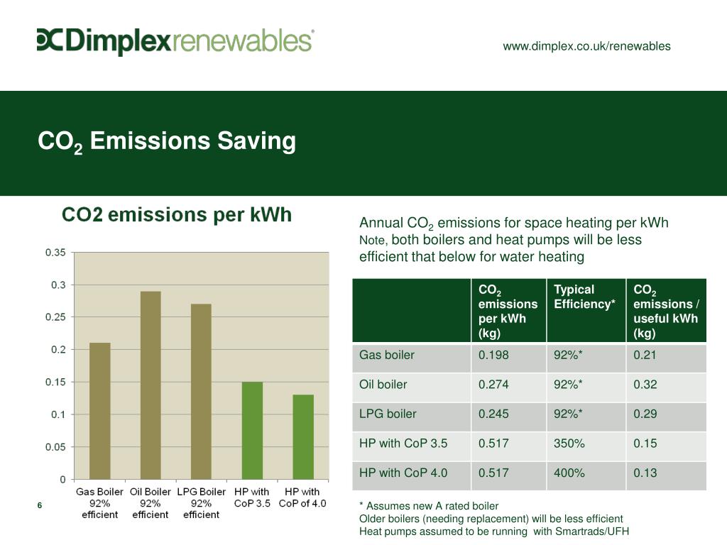CO2 Emissions Saving Annual CO2 emissions for space heating per kWh Note, both boilers and heat pumps will be less efficient that below for water heating * Assumes new A rated boiler Older boilers (needing replacement) will be less efficient Heat pumps assumed to be running with Smartrads/UFH