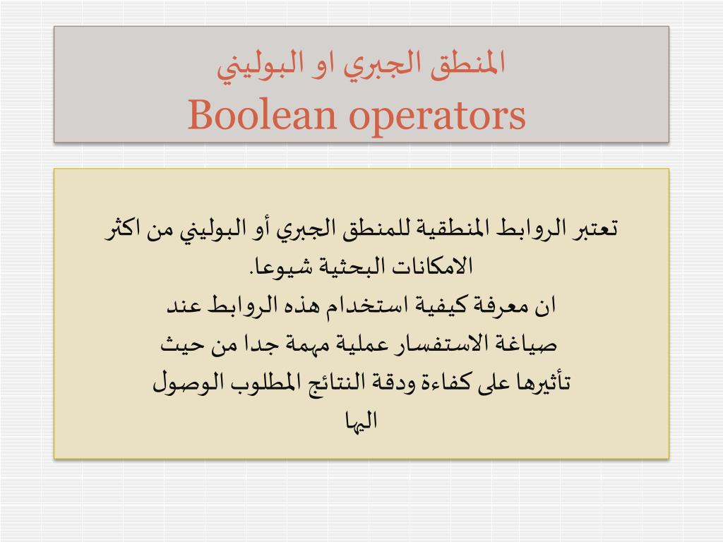 المنطق الجبري اوالبولينيBoolean operators تعتبر الروابط المنطقية للمنطق الجبري أو البوليني من اكثر الامكانات البحثية شيوعا. ان معرفة كيفية استخدام هذه الروابط عند صياغة الاستفسار عملية مهمة جدا من حيث تأثيرها على كفاءة ودقة النتائج المطلوب الوصول اليها