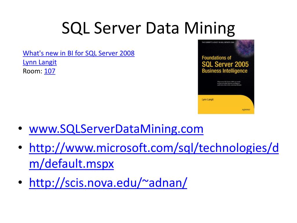 SQL Server Data Mining What's new in BI for SQL Server 2008 Lynn Langit Room: 107 • www.SQLServerDataMining.com • http://www.microsoft.com/sql/technologies/dm/default.mspx • http://scis.nova.edu/~adnan/