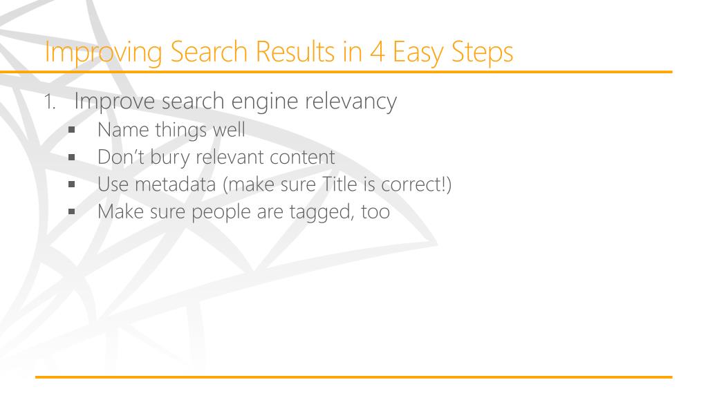 Improving Search in 4 Easy Steps • Improve search engine relevancy • Enhance with stuff outside the engine • Review search reports and end-user feedback • Improve the overall experience