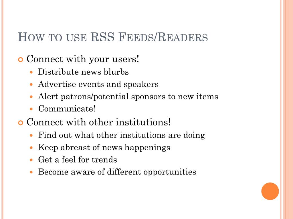 How to use RSS Feeds/Readers • Connect with your users! • Distribute news blurbs • Advertise events and speakers • Alert patrons/potential sponsors to new items • Communicate! • Connect with other institutions! • Find out what other institutions are doing • Keep abreast of news happenings • Get a feel for trends • Become aware of different opportunities