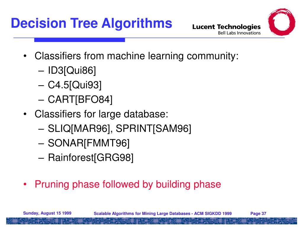 Decision Tree Algorithms • Building phase • Recursively split nodes using best splitting attribute for node • Pruning phase • Smaller imperfect decision tree generally achieves better accuracy • Prune leaf nodes recursively to prevent over-fitting