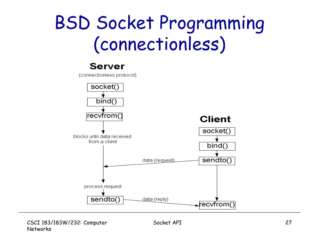 A summary of BSD Socket protocol localAddr,localPort remoteAddr, remotePort bind() socket() listen(), accept() conn-oriented server connect() conn-oriented client socket() bind() recvfrom() socket() connectionless server sendto() socket() bind() connectionless client Socket API