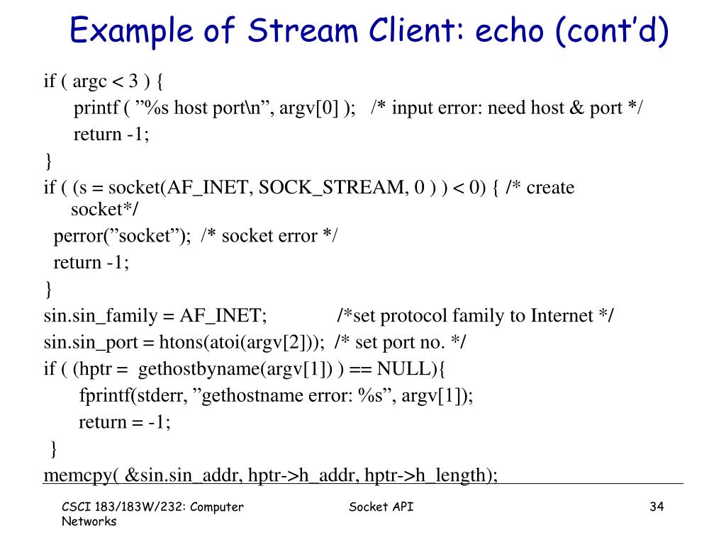 Example of Stream Client: echo (cont’d) if ( argc < 3 ) { printf ( ”%s host port\n”, argv[0] ); /* input error: need host & port */ return -1; } if ( (s = socket(AF_INET, SOCK_STREAM, 0 ) ) < 0) { /* create socket*/ perror(”socket”); /* socket error */ return -1; } sin.sin_family = AF_INET; /*set protocol family to Internet */ sin.sin_port = htons(atoi(argv[2])); /* set port no. */ if ( (hptr = gethostbyname(argv[1]) ) == NULL){ fprintf(stderr, ”gethostname error: %s”, argv[1]); return = -1; } memcpy( &sin.sin_addr, hptr->h_addr, hptr->h_length); Socket API