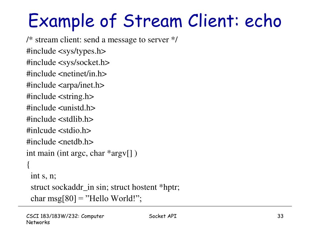 Example of Stream Client: echo /* stream client: send a message to server */ #include <sys/types.h> #include <sys/socket.h> #include <netinet/in.h> #include <arpa/inet.h> #include <string.h> #include <unistd.h> #include <stdlib.h> #inlcude <stdio.h> #include <netdb.h> int main (int argc, char *argv[] ) { int s, n; struct sockaddr_in sin; struct hostent *hptr; char msg[80] = ”Hello World!”; Socket API