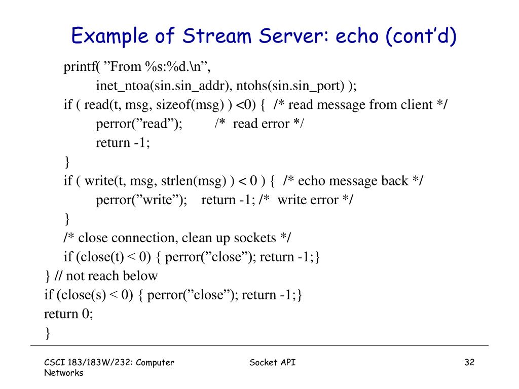 Example of Stream Server: echo (cont’d) if (argc < 2) { printf (”%s port\n”, argv[0] ); /* input error: need port no! */ return -1; } if ( (s = socket(AF_INET, SOCK_STREAM, 0 ) ) < 0) { /* create socket*/ perror(”socket”); /* socket error */ return -1; } sin.sin_family = AF_INET; /*set protocol family to Internet */ sin.sin_port = htons(atoi(argv[1])); /* set port no. */ sin.sin_addr.s_addr = INADDR_ANY; /* set IP addr to any interface */ if (bind(s, (struct sockaddr *)&sin, sizeof(sin) ) < 0 ){ perror(”bind”); return -1; /* bind error */ } Socket API