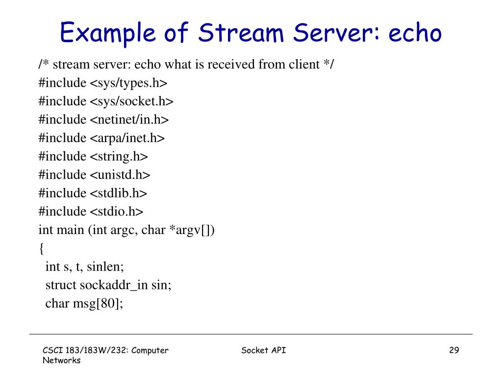 Example of Stream Server: echo /* stream server: echo what is received from client */ #include <sys/types.h> #include <sys/socket.h> #include <netinet/in.h> #include <arpa/inet.h> #include <string.h> #include <unistd.h> #include <stdlib.h> #include <stdio.h> int main (int argc, char *argv[]) { int s, t, sinlen; struct sockaddr_in sin; char msg[80]; Socket API