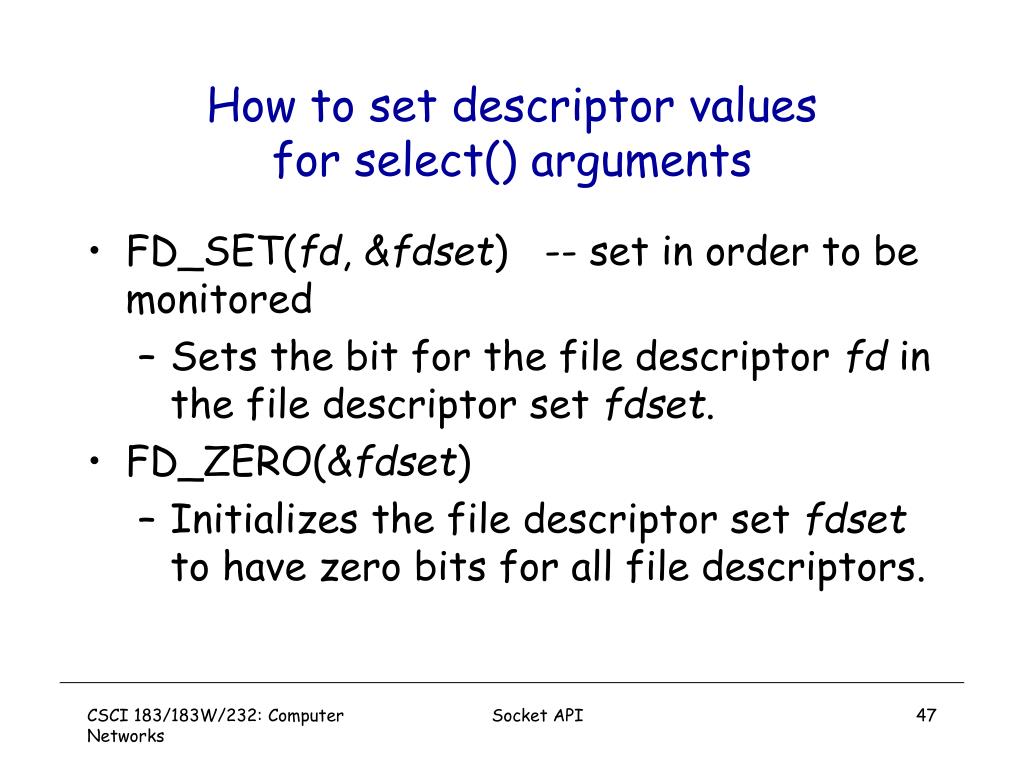 How to set descriptor valuesfor select() arguments • FD_SET(fd, &fdset) -- set in order to be monitored • Sets the bit for the file descriptor fd in the file descriptor set fdset. • FD_ZERO(&fdset) • Initializes the file descriptor set fdset to have zero bits for all file descriptors. Socket API