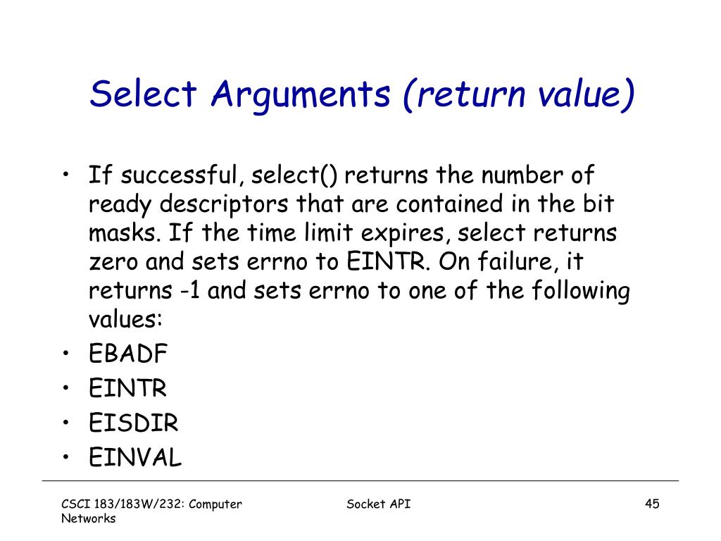 Select Arguments (return value) • If successful, select() returns the number of ready descriptors that are contained in the bit masks. If the time limit expires, select returns zero and sets errno to EINTR. On failure, it returns -1 and sets errno to one of the following values: • EBADF • EINTR • EISDIR • EINVAL Socket API