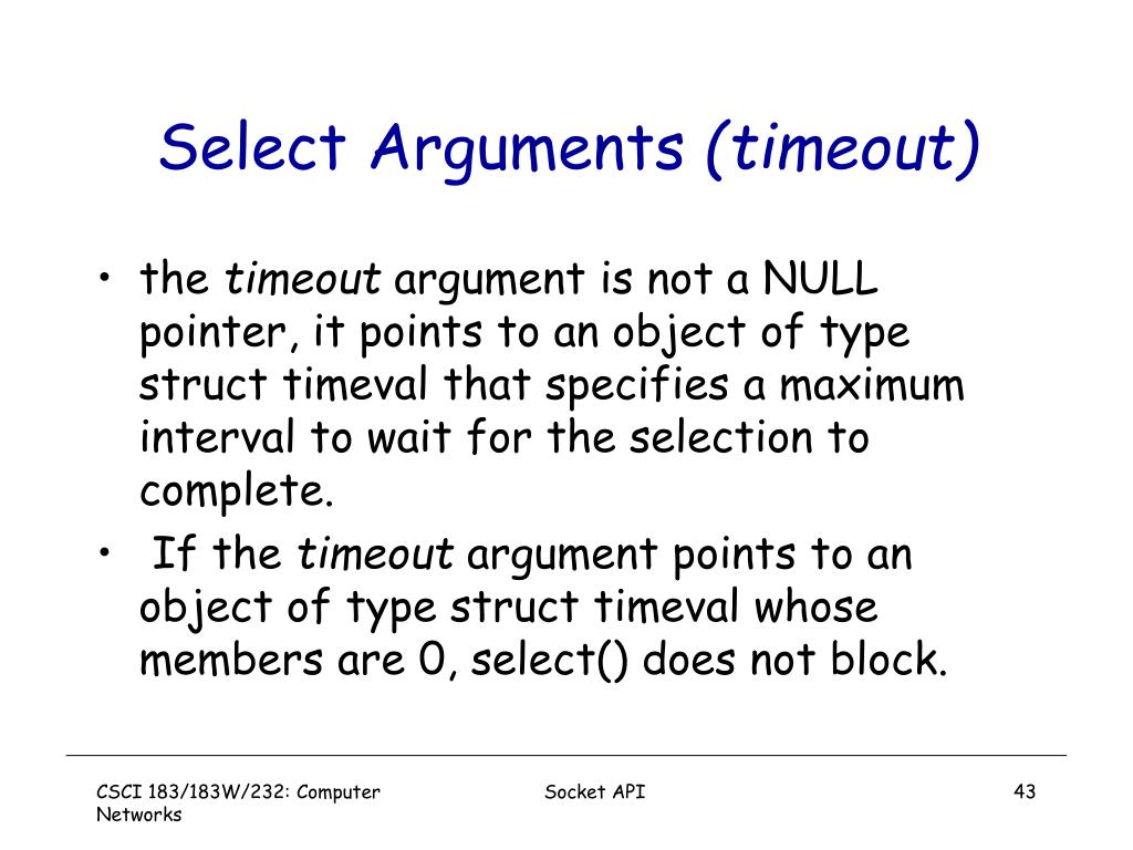 Select Arguments (timeout) • the timeout argument is not a NULL pointer, it points to an object of type struct timeval that specifies a maximum interval to wait for the selection to complete. • If the timeout argument points to an object of type struct timeval whose members are 0, select() does not block. Socket API