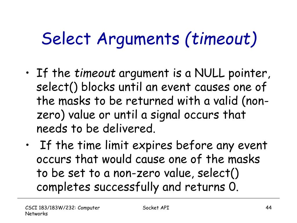 Select Arguments (timeout) • If the timeout argument is a NULL pointer, select() blocks until an event causes one of the masks to be returned with a valid (non-zero) value or until a signal occurs that needs to be delivered. • If the time limit expires before any event occurs that would cause one of the masks to be set to a non-zero value, select() completes successfully and returns 0. Socket API