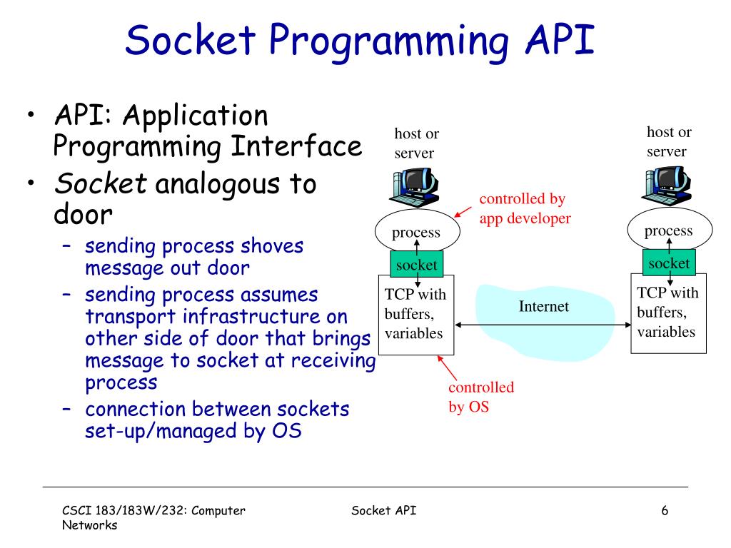 host or server host or server controlled by app developer process process socket socket Internet controlled by OS TCP with buffers, variables TCP with buffers, variables Socket Programming API • API: Application Programming Interface • Socket analogous to door • sending process shoves message out door • sending process assumes transport infrastructure on other side of door that brings message to socket at receiving process • connection between sockets set-up/managed by OS Socket API