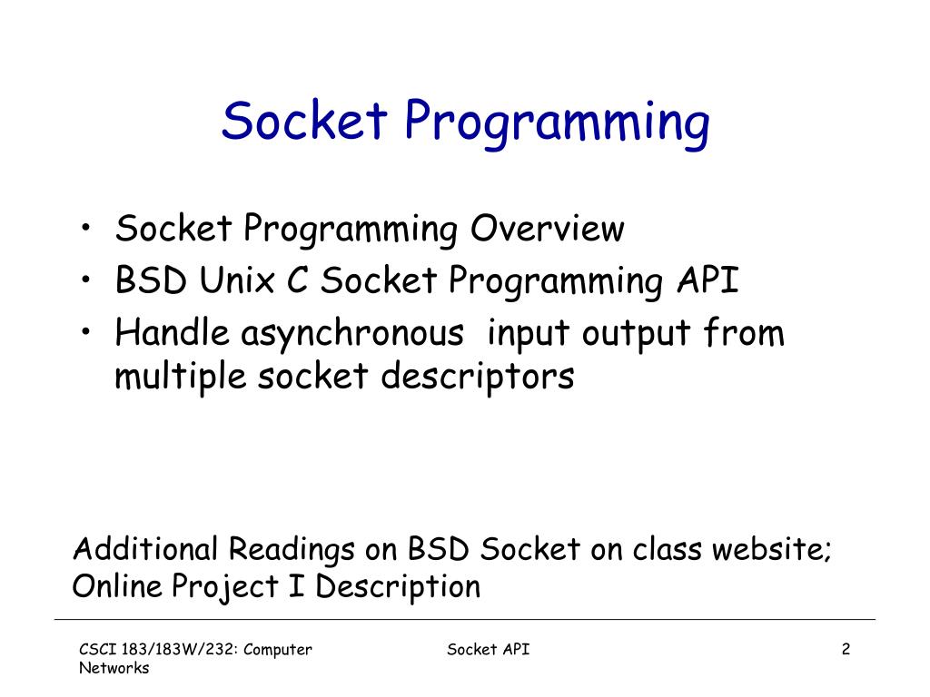 Socket Programming • Socket Programming Overview • BSD Unix C Socket Programming API • Handle asynchronous input output from multiple socket descriptors Additional Readings on BSD Socket on class website; Online Project I Description Socket API