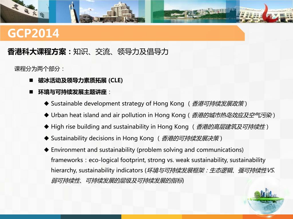 GCP2014 香港科大课程方案:知识、交流、领导力及倡导力 • 课程分为两个部分: • 破冰活动及领导力素质拓展 (CLE) • 环境与可持续发展主题讲座: • Sustainable development strategy of Hong Kong (香港可持续发展政策) • Urban heat island and air pollution in Hong Kong(香港的城市热岛效应及空气污染) • High rise building and sustainability in Hong Kong (香港的高层建筑及可持续性) • Sustainability decisions in Hong Kong(香港的可持续发展决策) • Environment and sustainability (problem solving and communications) frameworks:eco-logical footprint, strong vs. weak sustainability, sustainability hierarchy, sustainability indicators (环境与可持续发展框架:生态逻辑、强可持续性VS.弱可持续性、可持续发展的层级及可持续发展的指标)