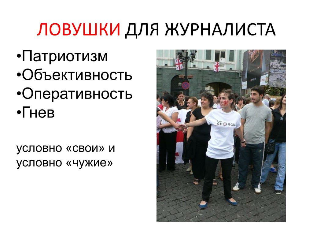 ЛОВУШКИ ДЛЯ ЖУРНАЛИСТА • Патриотизм • Объективность • Оперативность • Гнев • условно «свои» и условно «чужие»
