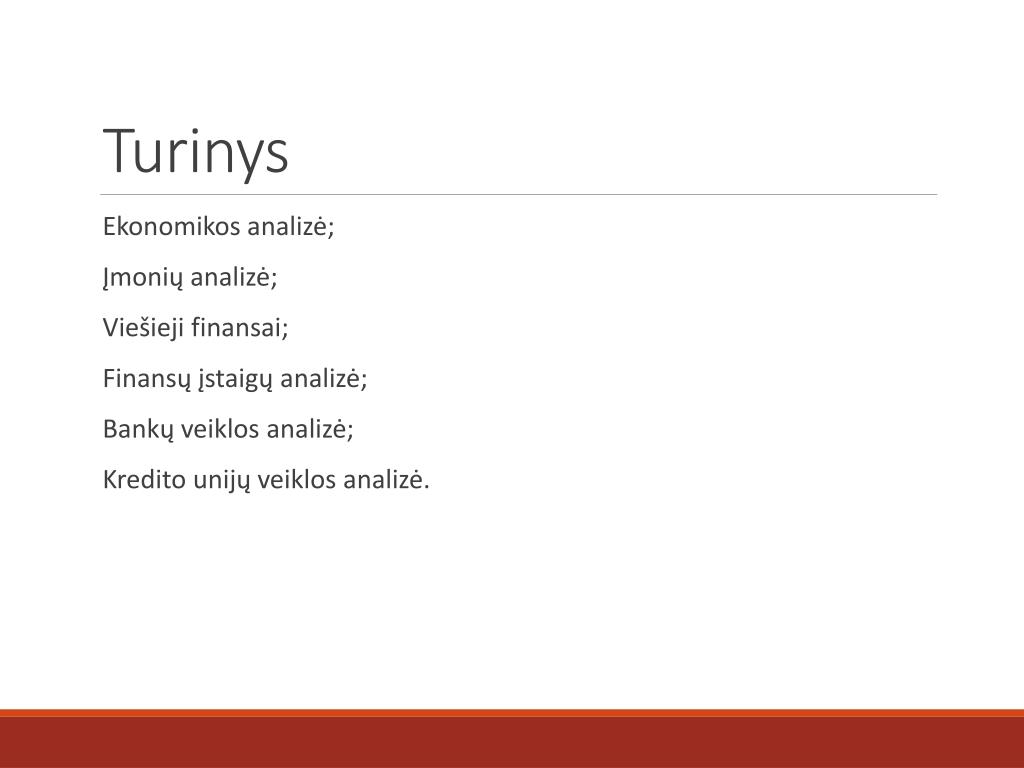 Turinys • Ekonomikos analizė; • Įmonių analizė; • Viešiejifinansai; • Finansų įstaigų analizė; • Bankų veiklos analizė; • Kredito unijų veiklos analizė.