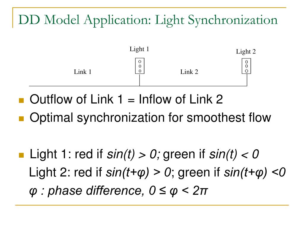 DD Model Application: Light Synchronization Light 1 Light 2 • Outflow of Link 1 = Inflow of Link 2 • Optimal synchronization for smoothest flow • Light 1: red if sin(t) > 0; green if sin(t) < 0 Light 2: red if sin(t+φ) > 0; green if sin(t+φ) <0 φ : phase difference, 0 ≤ φ < 2π Link 1 Link 2