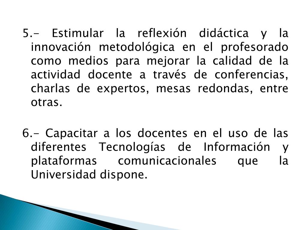 5.- Estimular la reflexión didáctica y la innovación metodológica en el profesorado como medios para mejorar la calidad de la actividad docente a través de conferencias, charlas de expertos, mesas redondas, entre otras. 6.- Capacitar a los docentes en el uso de las diferentes Tecnologías de Información y plataformas comunicacionales que la Universidad dispone.