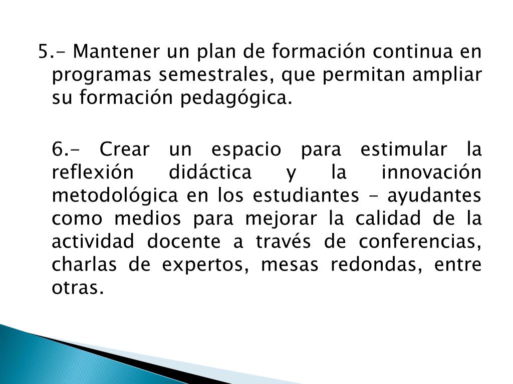 5.- Mantener un plan de formación continua en programas semestrales, que permitan ampliar su formación pedagógica. 6.- Crear un espaciopara estimular la reflexión didáctica y la innovación metodológica en los estudiantes - ayudantes como medios para mejorar la calidad de la actividad docente a través de conferencias, charlas de expertos, mesas redondas, entre otras.