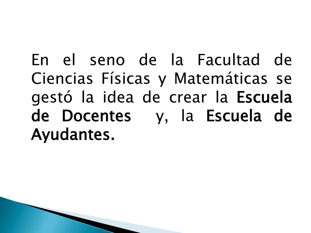 En el seno de la Facultad de CienciasFísicas y Matemáticasse gestóla idea de crear la Escuela de Docentesy, la Escuela de Ayudantes.